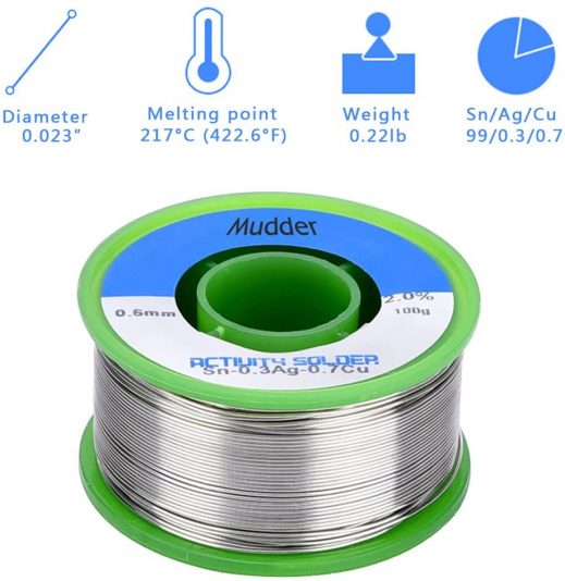 The diameter of Mudder lead – free wire solder is 0.0236 inch or 0.6 mm that is quite large and make it a lot easier to use. The weight is 100 gram spools. Because Mudder premium lead – free solder is made fully from ingredients other than lead, the melting temperature is a slightly higher than the ordinary lead – based solder.